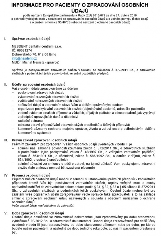 Společnost NESDENT dentální centrum s.r.o., MUDr. Michal Nesrsta jako správce osobních údajů, zpracovává Vaše osobní údaje. Nová pravidla o ochraně osobních údajů si můžete přečíst zde anebo přímo v naší čekárně.